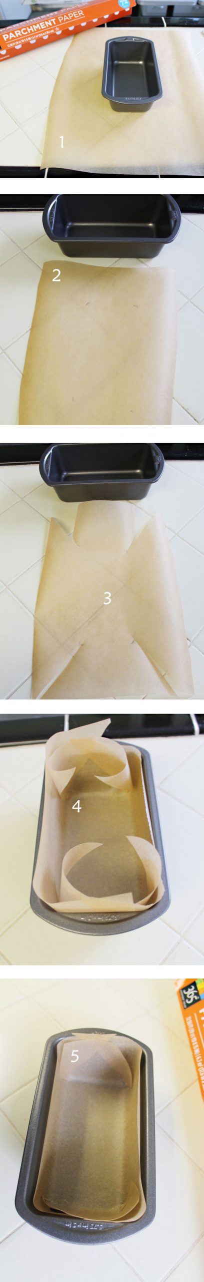 HOW TO LINE A PAN WITH PARCHMENT PAPER(1) Cut a piece of parchment paper larger than your pan, and set your pan on it. (2) Mark where the four corners are. (3) Cut from the corners into the marks, and also trim the long sides so that they are the approximate height of your baking pan. (4) Press the paper into the pan, pressing firmly into the corners so it will conform to the pan. Flatten the paper against the insides of the pan, and trim off any that rises above the top edge of the pan so it doesn’t burn. (5) This is what the finished project looks like (this is my “half” loaf pan).